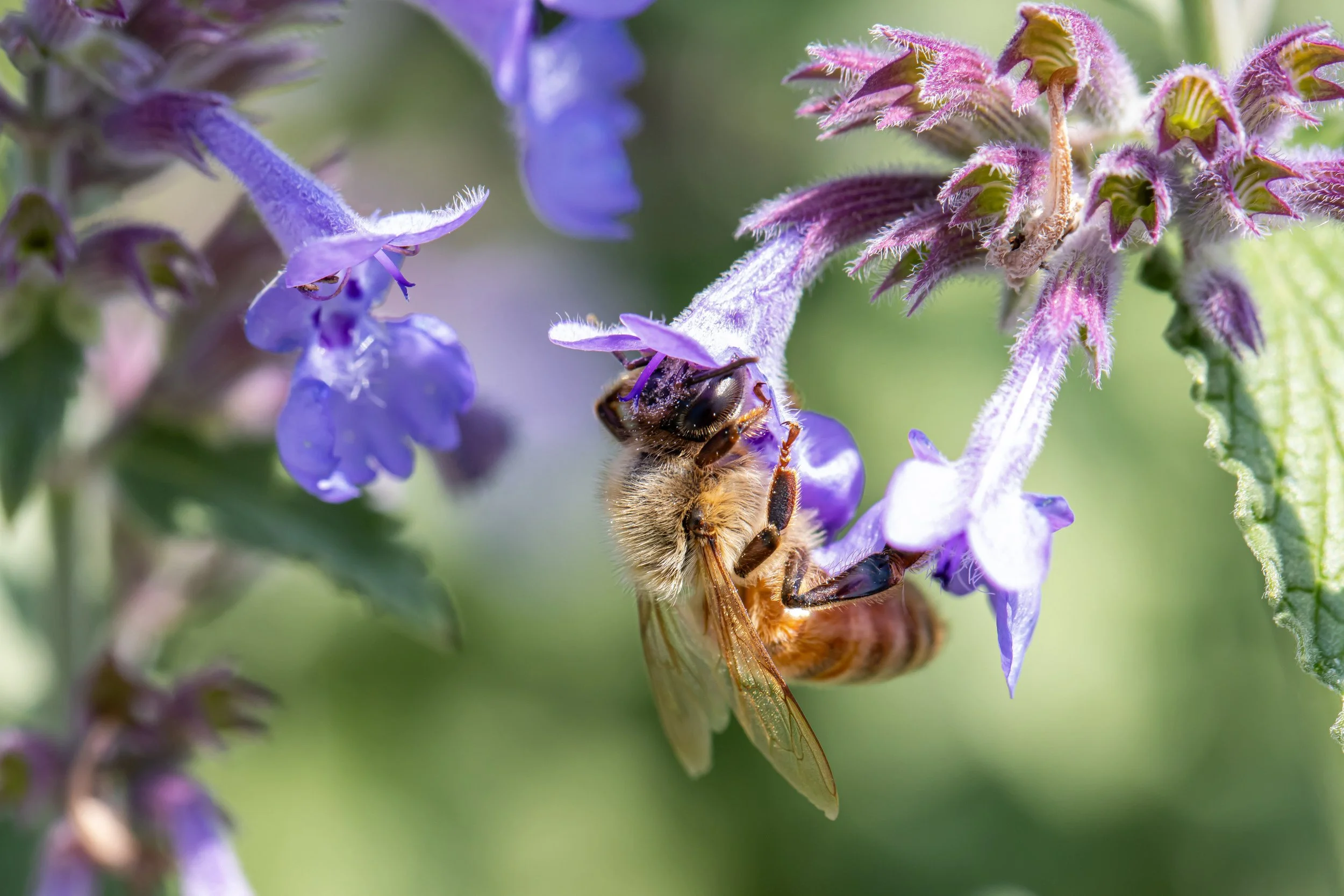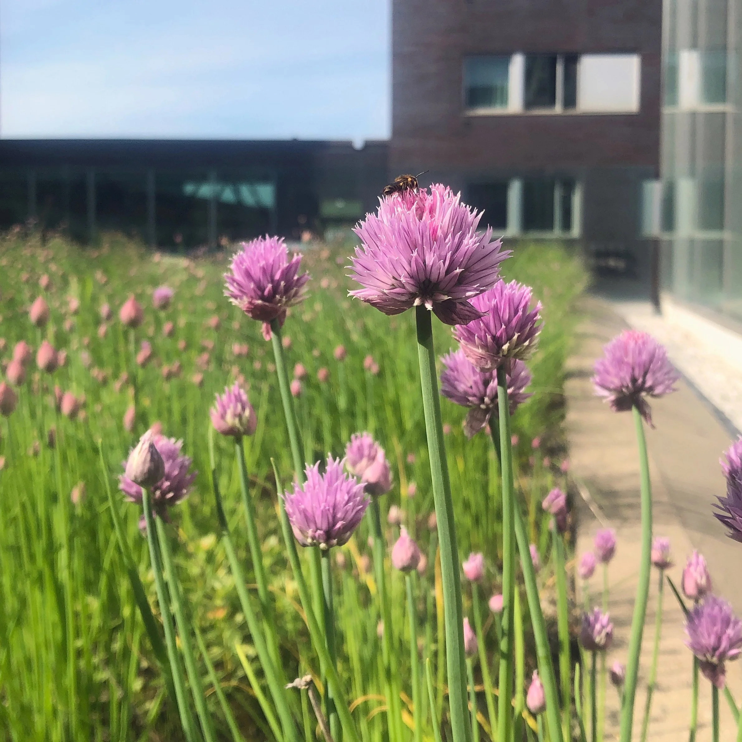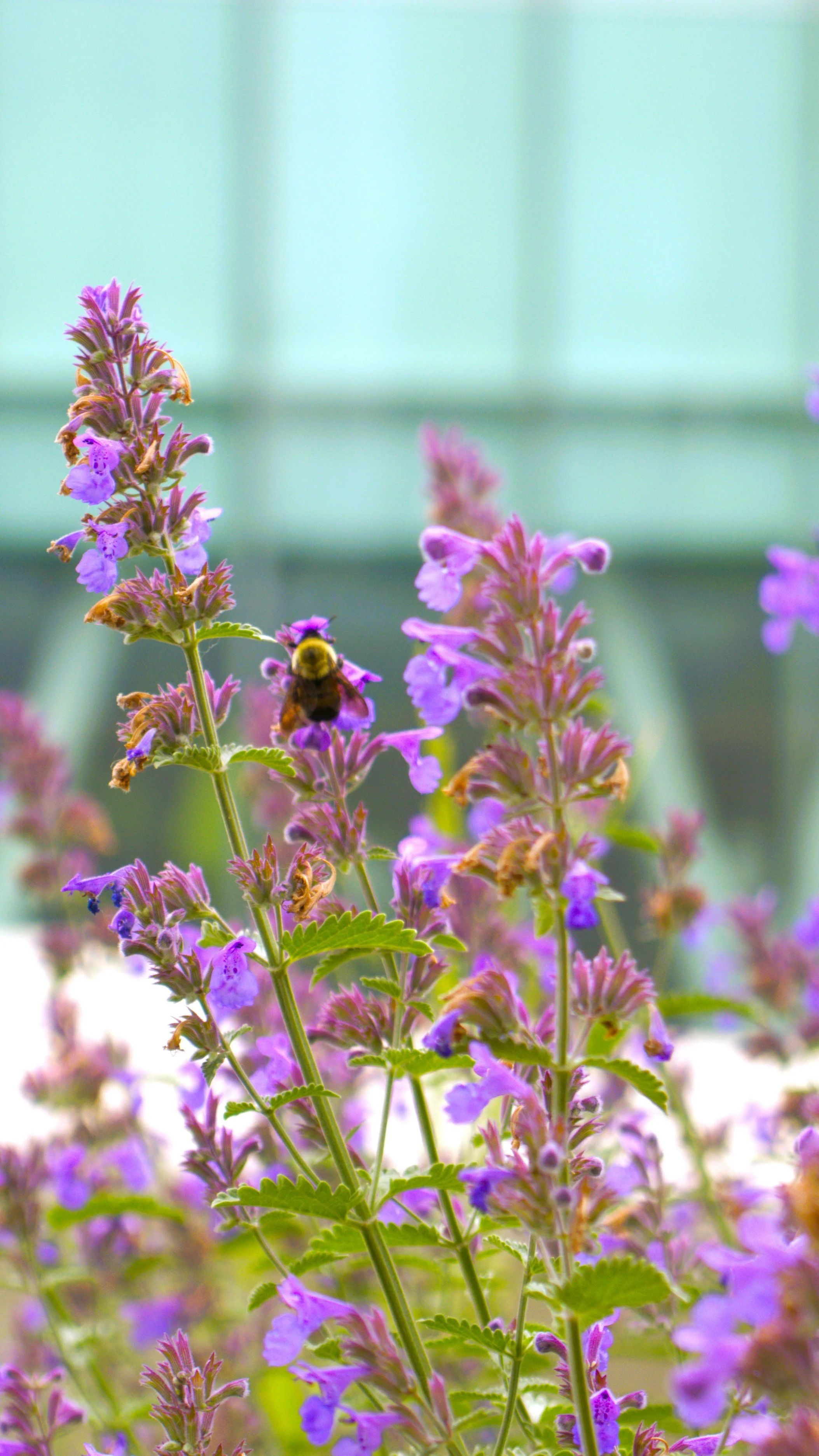 “Abeille butinant parmi les fleurs de sauge, sur la terrasse du bâtiment D".”