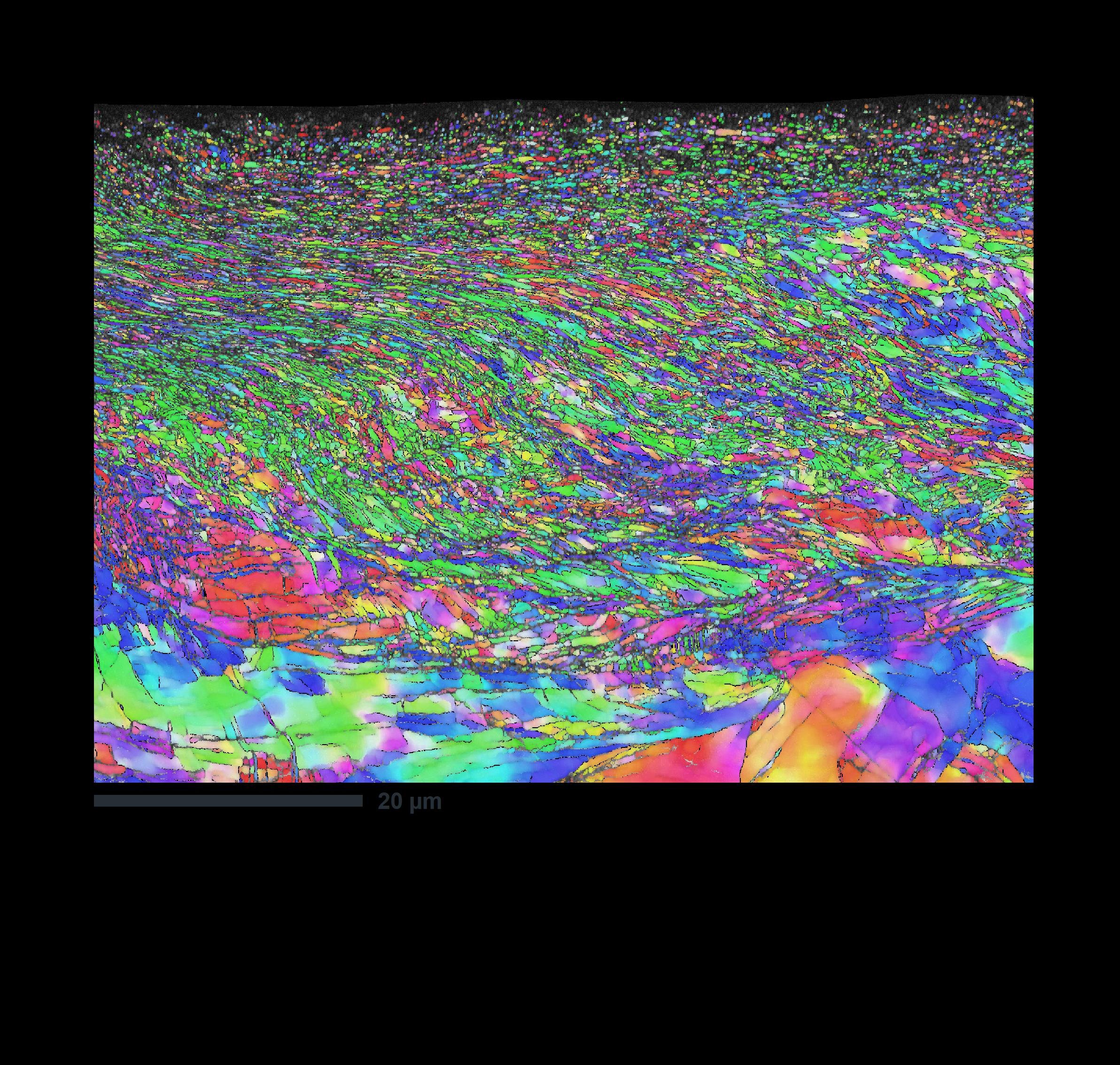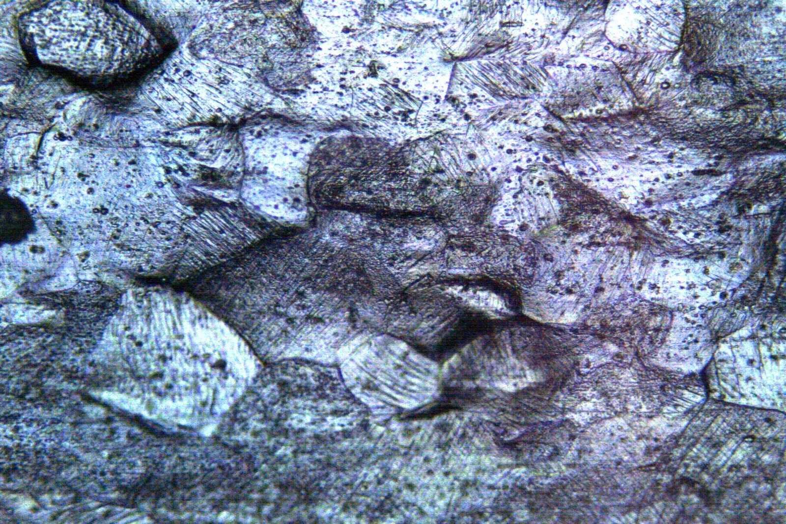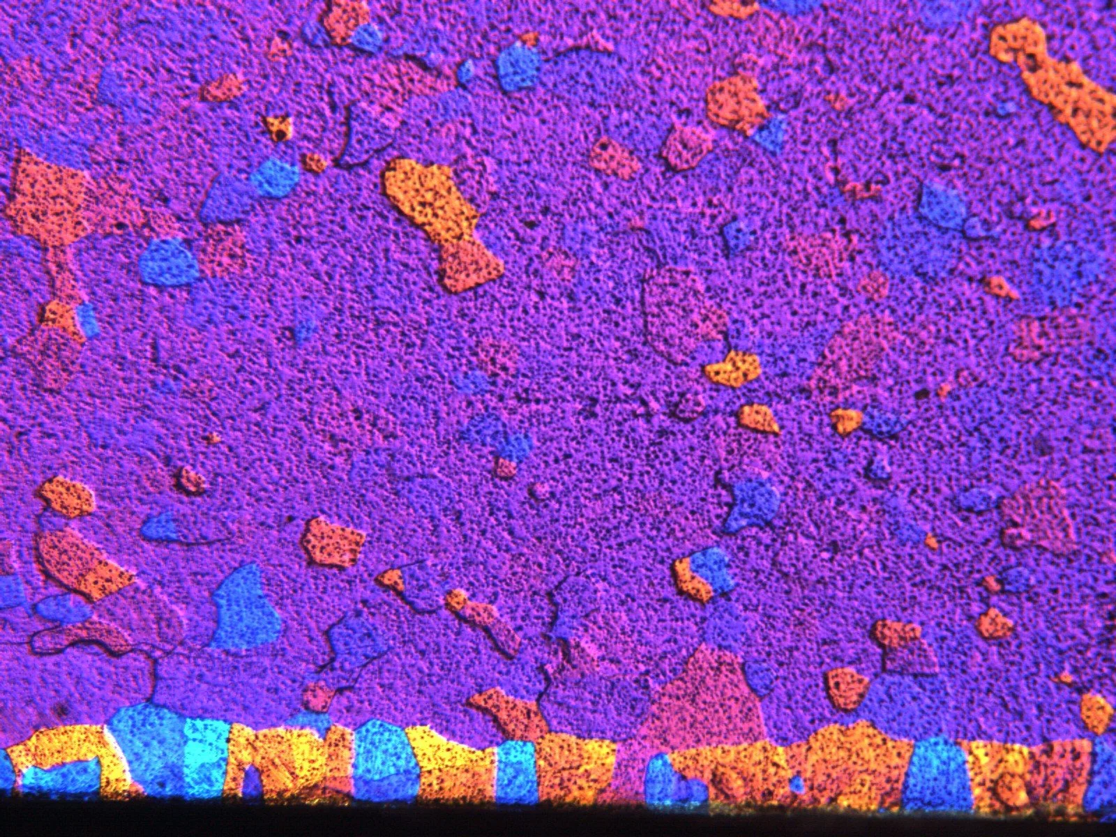 “Microstructure d'un alliage d'aluminium AA6063 déformée à 25% révélée par polissage, attaque chimique et vue au microscope optique.”