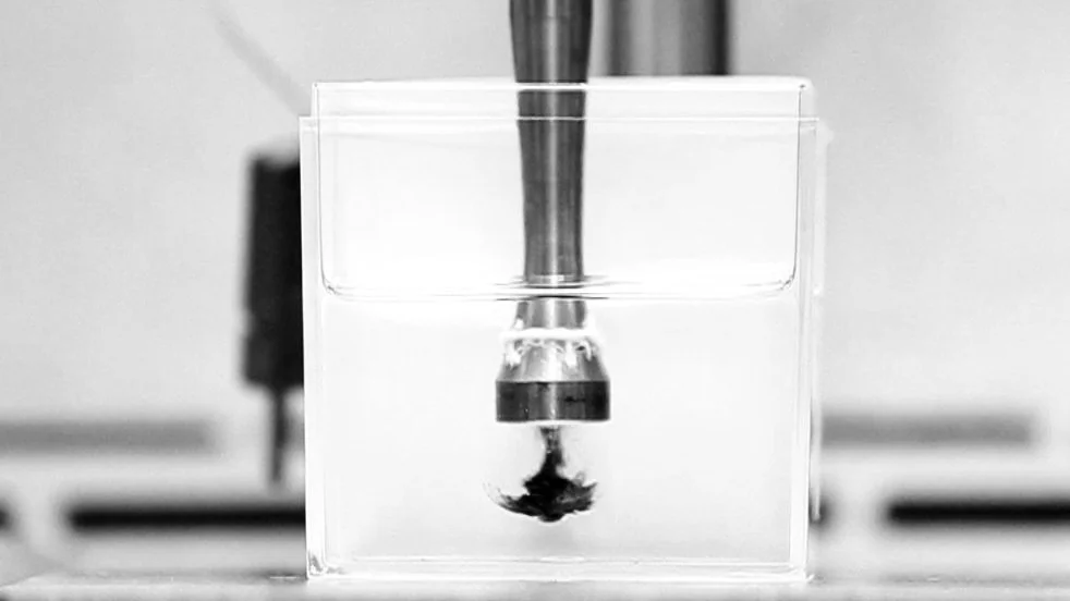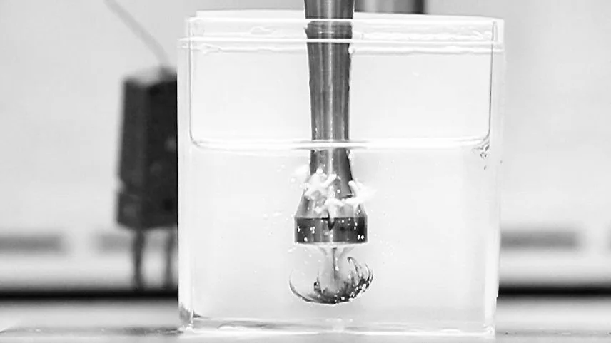 “Une solution polymérique est étirée entre deux plaques, formant ainsi un pont capillaire. Cette expérience vise à caractériser les liquides en extension. L'équipement utilisé est le CaBER (Capillary Breakup Extensional Rheometer), fabriqué à l'ÉTS.”